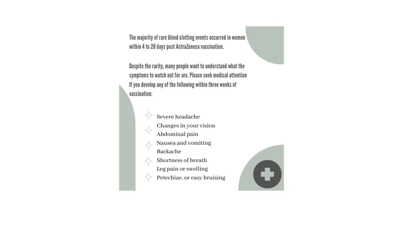 Individual risk is not the same as absolute risk and can be higher or lower depending on age or gender, among other factors. For example, the risk of VITT might be higher than one per million in women under 30. Globally, the majority of these events occurred in women in the 20 to 55 age group and typically within four to 20 days post-vaccination. VITT is treatable if detected early.