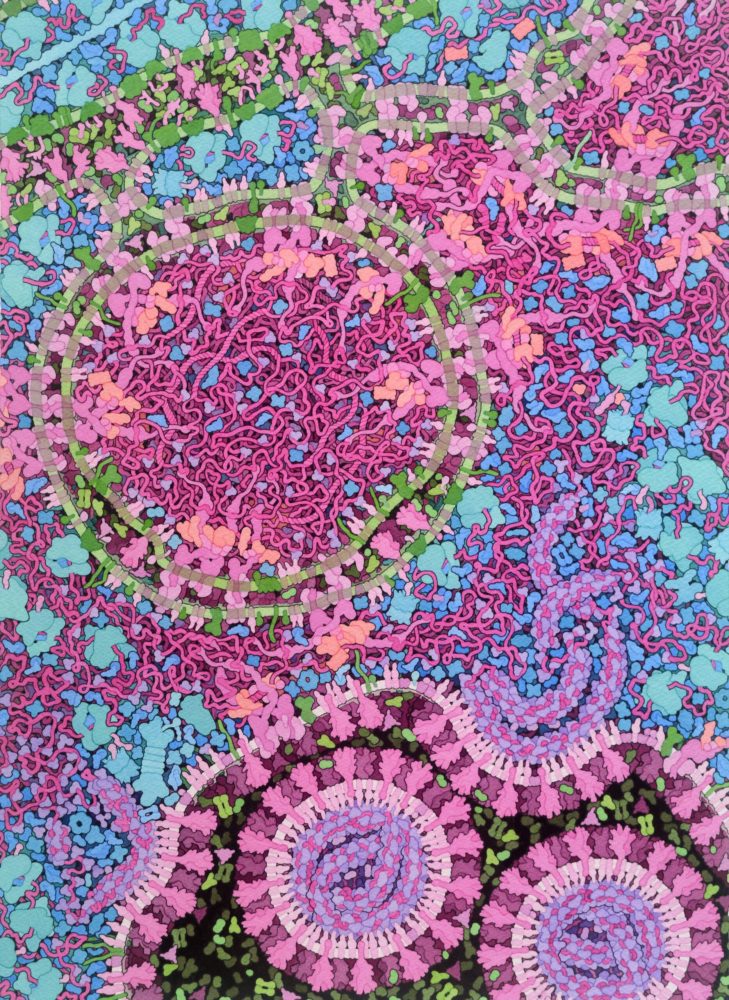 This illustration shows a cross section through a cell infected with a coronavirus such as SARS-CoV-2. It shows a time point when the virus is actively replicating, and new viruses are being created. The cell’s molecules are shown in blues and greens, and the viral molecules are shown in pinks and purples. Courtesy of David S. Goodsell, RCSB Protein Data Bank