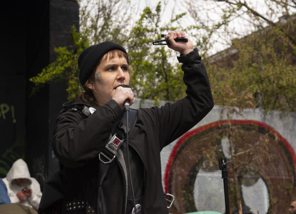 Eris Nyx speaks to the crowd gathered for the sixth anniversary of the declaration of the overdose crisis as a public health emergency. The event was organized by the Coalition of Peers Dismantling the Drug War in partnership with peer groups, DULF and the Vancouver Area Network of Drug Users (VANDU).