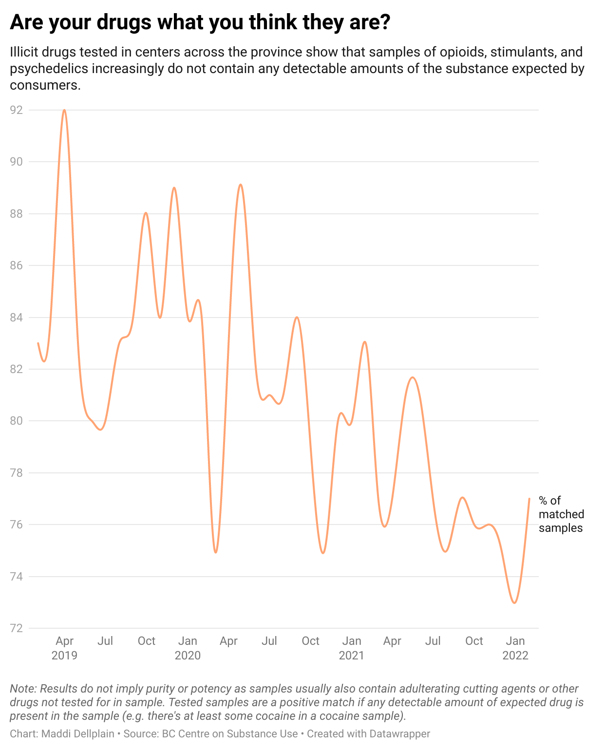 Over the past three years, drugs obtained from the illicit market have become increasingly unpredictable. One BCCSU report shows that only 73 per cent of the drugs tested in January actually contained the drug that the client expected in any detectable amount.