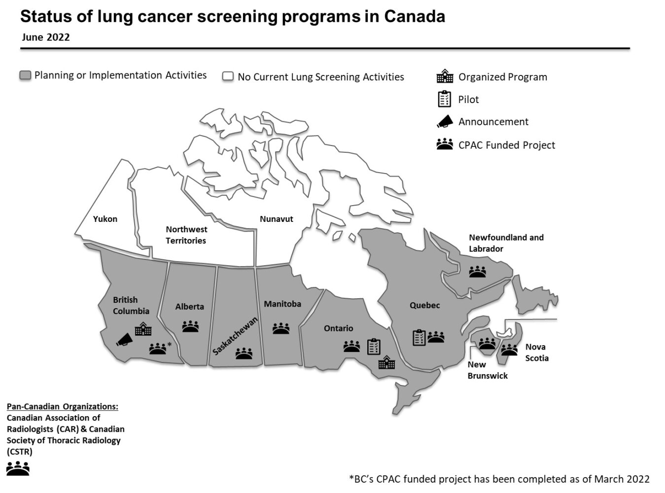 The figure below demonstrates LDCT lung-cancer screening activities across Canada as of 2022.