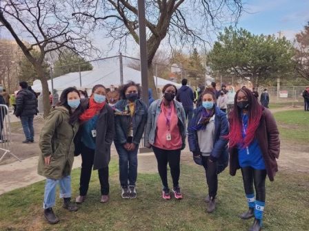 Angela – second from the left – with other ‘good troublemakers’ at Black Creek CHC vaccination pop-up clinic. Provided by Angela Robertson and depicted in the artist’s rendering above.