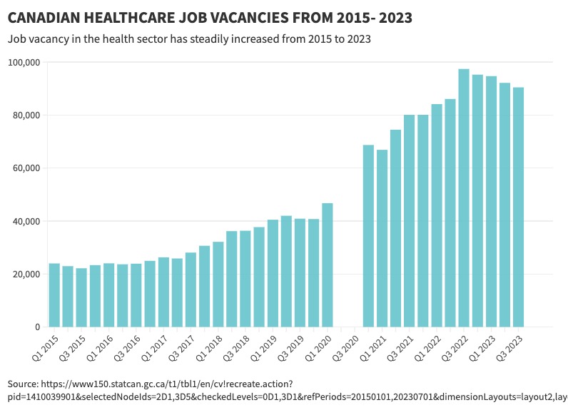 It’s not a lack of hospital beds or buildings that’s driving this crisis. Our health-care systems are collapsing because there aren’t enough people willing to work in them. As Prince Edward Island Health Minister Mark McLane said last fall, when Canada’s provincial health ministers gathered in Charlottetown, the top three issues facing our health systems “are staffing, staffing and staffing.” The number of vacant health-care positions are now almost 92,000, up from about 22,500 in 2015, according to Statistics Canada.