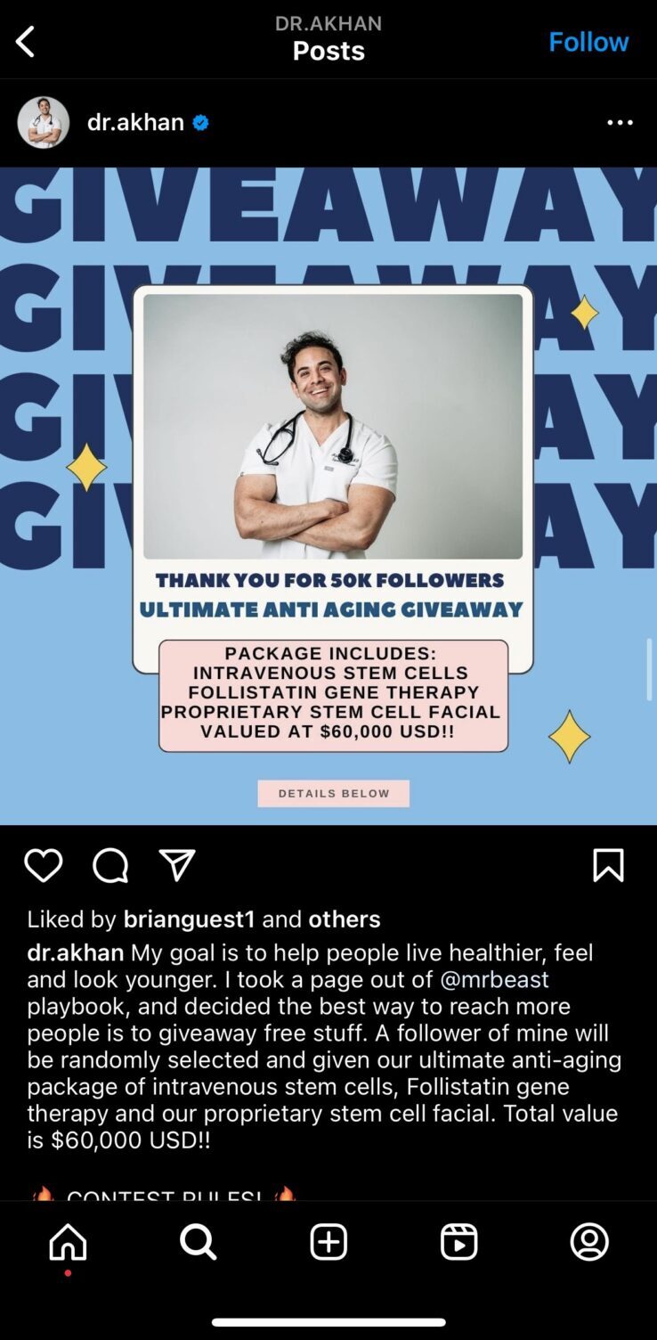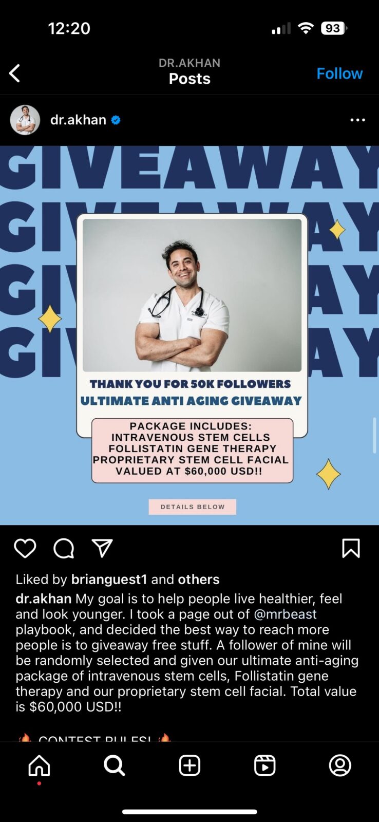 He has posted a giveaway for a stem cell anti-aging package to celebrate reaching 50,000 followers, directly violating the CPSO guideline to avoid “offering medical treatments as prizes in contests.” He shares extraordinary before-and-after photos of stem cells promising copious hair growth and bodybuilder-level muscle gain. He even posts his own anti-aging regime, comprised of treatments he provides, that he claims should help him live to 150 years old.