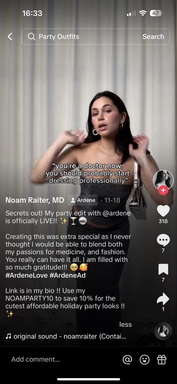 It is hard to distinguish where the physician ends and the influencer begins in Raiter’s content. She leverages her identity as a physician while promoting a collaboration with Canadian fast-fashion company Ardene, modelling clothing under the tongue-in-cheek caption “you’re a doctor now, you should probably start dressing professionally.” Similarly, she has shared a promotional video in which she attributes her productivity and success to the use of various Samsung Galaxy devices.