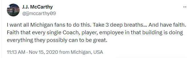 A day after the loss, star quarterback recruit and soon-to-be Wolverine J.J. McCarthy sent out this tweet: